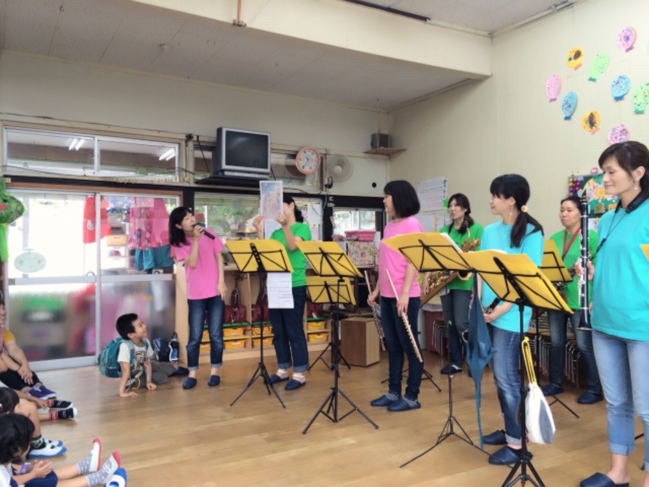 今年は朝から大雨警報が発令し、メンバーの小学校、幼稚園も休校か?登校か?でやきもきした朝でした。ひとりをのぞいて無事子供たちも登校&登園でき(一人だけ休校…(泣))、訪問する幼稚園も通常通り登園日になったで、今年も無事に演奏会を開く事ができました。